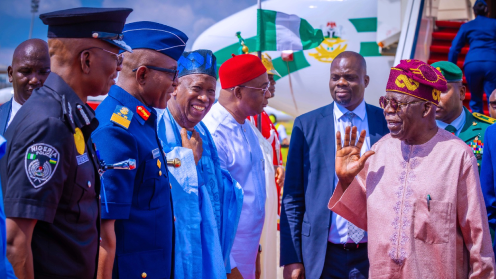 Tinubu was received by his Chief of Staff, Femi Gbajabiamila; the Minister of the Federal Capital Territory, Nyesom Wike; the National Security Adviser, Nuhu Ribadu and the Secretary to the Government of the Federation, George Akume, among others.